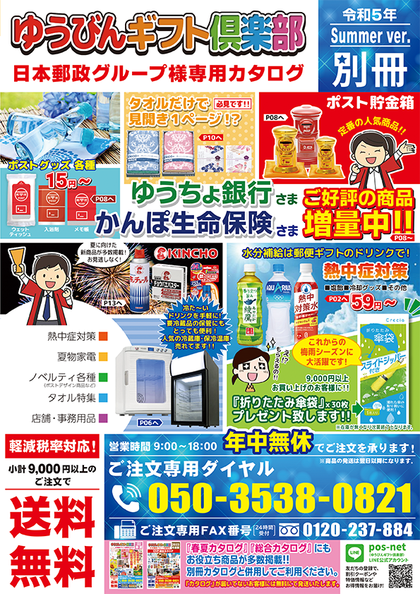 お知らせ/カタログ/ゆうびんギフト倶楽部 2023年別冊カタログSummer.ver発行と配信開始 2023年5月15日 by 郵便ギフト 2023年春夏カタログが発行されました。 ゆうちょ銀行様・かんぽ生命保険様向け商品を増量いたしました。また、最新の夏商品も多数登場しております! 別冊カタログSummer.verはこちらから!