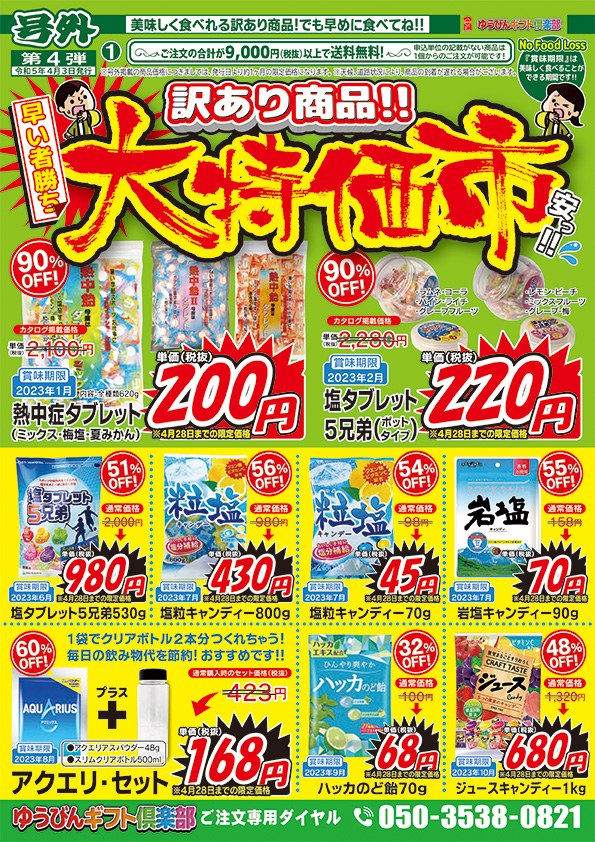 お知らせ/チラシ/ゆうびんギフト倶楽部 2023年号外第4弾号配信 2023年4月3日 by 郵便ギフト 2023年号外チラシ第4弾のチラシが発行されました。 号外の期間中にしか買えない価格やキャンペーンがあるので是非チェックしてください! ※号外掲載価格につきましては、発行日より約1ヶ月の限定価格になります チラシはこちら!